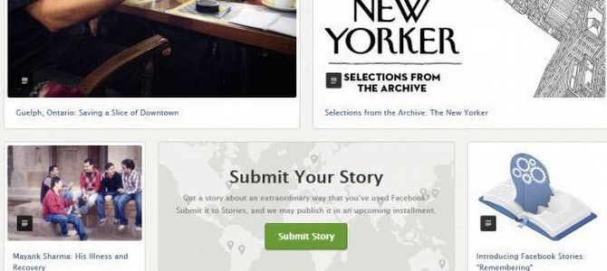 Stories, Facebook tarafından şöyle tanımlanıyor: "Facebook'un 950 milyondan fazla kişiden oluşan topluluğunun oluşurduğu olağanüstü, düşündürücü ve sıra dışı makaleleri ve fikirleripaylaşmanın bir yolu." Stories için her ay yeni bir tema sağlanıyor. Bu ayın teması ise "Hatırlamak".